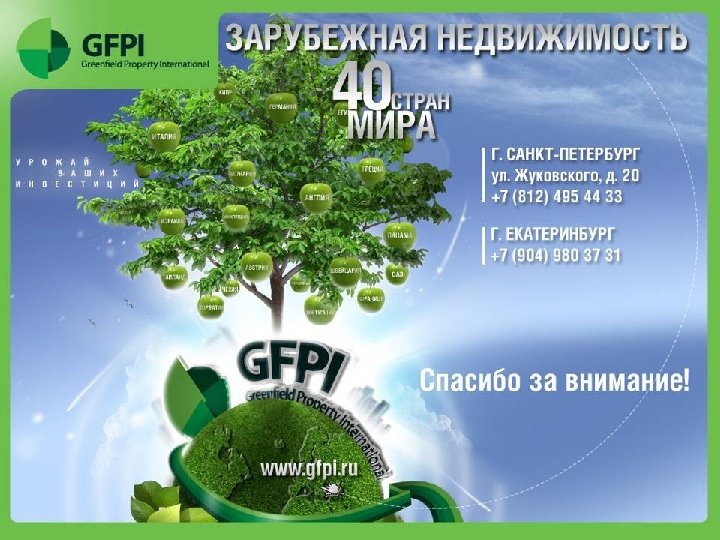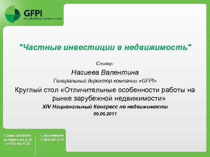 "Частные инвестиции в недвижимость" Спикер: Нагиева Валентина Генеральный директор компании «GFPI» Круглый стол «Отличительные особенности работы на рынке зарубежной недвижимости» ХIV Национальный Конгресс по недвижимости 06. 2011