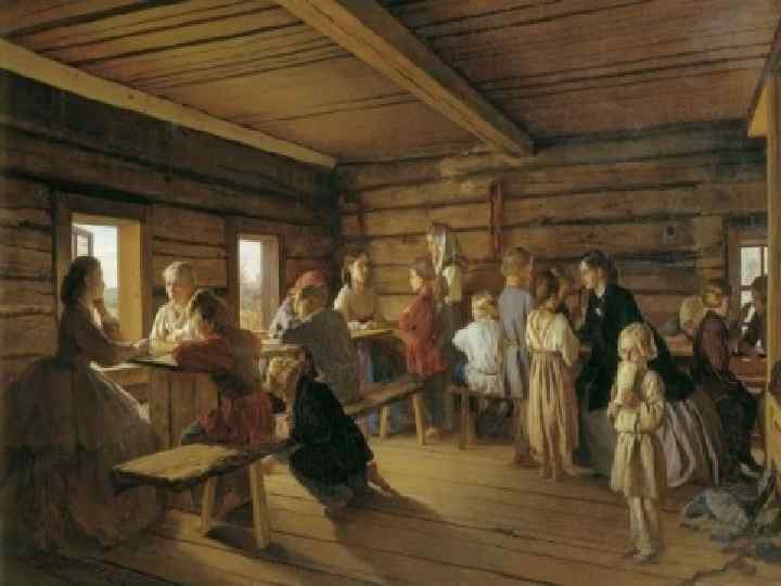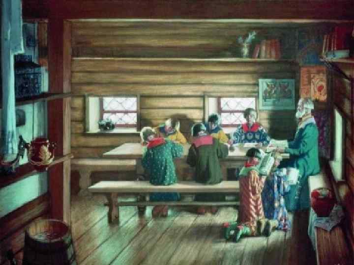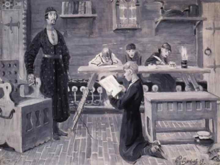Частные школы. • Учителями в школах XVII века были духовные лица, за свою работу они получали плату продуктами. Ученики посещали их утром и после обеда. Учились дети людей «всякого чина… и сана, славных и худородных, богатых и убогих, даже и до последних земледельцев» . • Поскольку главными учителями в то время являлось духовенство, то естественно, что начальное образование на Руси носило церковный характер. Занятия начинались и заканчивались молитвой. Продуманная таким образом система образования гармонично решала две задачи — давала подрастающему поколению основы грамотности и знаний и воспитывала его в духе христианской нравственности.