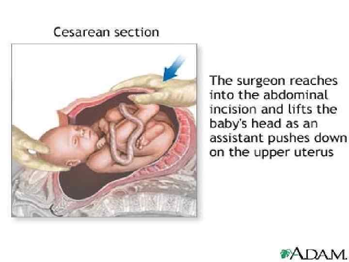 • Можно также рассечь стенку матки ножницами под контролем двух пальцев, вводимых в матку, что нам представляется более удобным, так как можно заранее наметить углы раны и исключить повреждение сосудистых пучков. • Операция кесарева сечения может осложниться предлежанием плаценты с расположением ее на передней стенке матки. В этом случае необходимо быстро разрезать нижний сегмент матки, пробуравить плаценту и через нее извлечь плод. • Извлечение головки плода обычно проводится рукой акушера после удаления из раны зеркал. В полость матки вводят четыре пальца руки, ладонной поверхностью обращенной к головке плода. Головку в зависимости от вида позиции плода (передний или задний) поворачивают личиком кзади или кпереди с последующим ее разгибанием или сгибанием. При этом происходит рождение головки, для облегчения которого ассистент осторожно надавливает рукой на дно матки, способствуя прорезыванию головки в рану матки. • После рождения головки хирург захватывает ее ладонями в области ушей плода и, осторожно потягивая, освобождает плечики, а затем и все туловище.