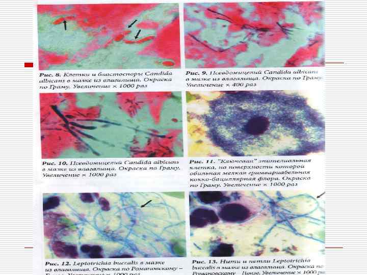 Урогенитальный кандидоз o грибы типа Candida (нити псевдомицелия, почкующиеся дрожжевые клетки)