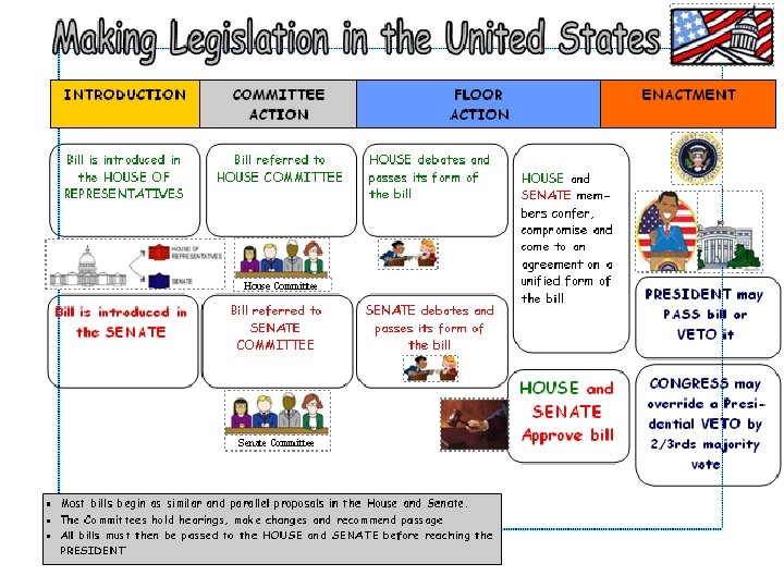 The UK has only one real chamber to deal with when it comes to legislation. The Lords can only delay bills The US has a bicameral system where BOTH houses share equal power necessitating compromise and negotiation It also leads to the potential problem of DIVIDED GOVERNMENT & GRIDLOCK. BILLS MUST BE APPROVED BY THE STANDING COMMITTEES OF BOTH CHAMBERS