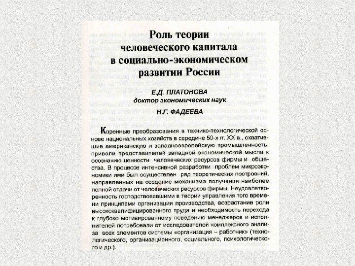 Зарубежные и отечественные учения о человеческом капитале анализируются в статье Платоновой и Фадеева «Роль теории человеческого капитала в социальноэкономическом развитии России» .
