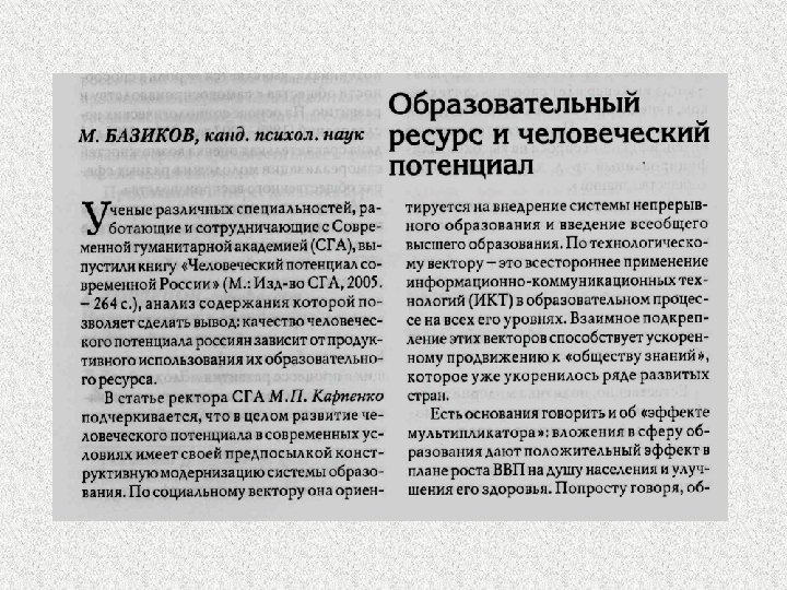 Качество человеческого потенциала россиян зависит от продуктивного использования их образовательного ресурса, к такому выводу приходит М. Базиков в статье «Образовательный ресурс и человеческий потенциал» .
