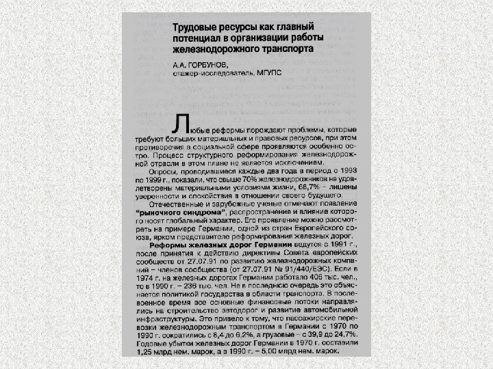 Свои особенности имеет управление человеческими ресурсами на железнодорожном транспорте. Влияние на кадровую политику железнодорожной отрасли оказала ее реформа. Последствия реформы исследуются в статье Горбунова «Трудовые ресурсы как главный потенциал в организации работы железнодорожного транспорта» .