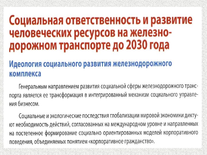 Важнейшей задачей социального развития железнодорожного транспорта является сохранение баланса между экономической результативностью отрасли и выполнением общественно значимых функций.