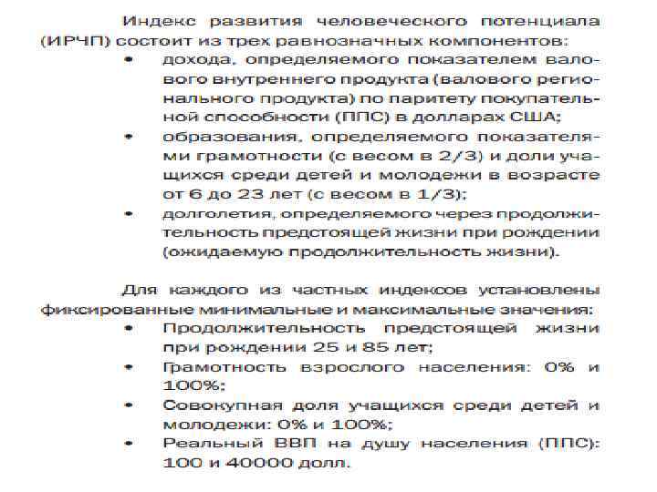 Индекс развития человеческого потенциала (ИРЧП) Предложен в 1990 г. пакистанским экономистом Махбубом уль-Хаком и с 1993 года используется ООН в ежегодном отчёте по развитию человеческого потенциала ИРЧП - индекс для сравнительной оценки бедности, грамотности, образования, средней продолжительности жизни и других показателей страны