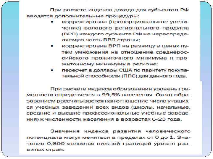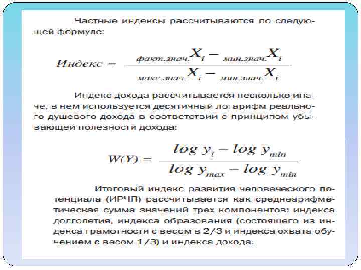 Показатели, учитывающиеся при подсчёте ИРЧП Компоненты ИРЧП: Средняя продолжительность предстоящей жизни при рождении (СППЖР) - оценивает долголетие Уровень грамотности взрослого населения страны (2/3 индекса) и совокупная доля учащихся (1/3 индекса) Уровень жизни, оценённый через ВВП на душу населения при паритете покупательной способности (ППС) в долларах США