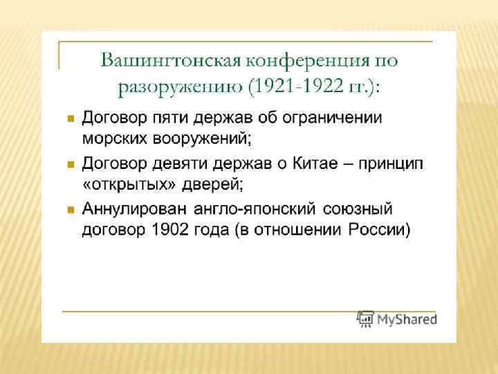ВАШИНГТОНСКАЯ КОНФЕРЕНЦИЯ. Усиление Японии на востоке вызвало беспокойство Европейских держав. Ограничение морских вооружений: США, Великобритания, Япония, Франция, Италия-5: 5: 3: 1, 75.