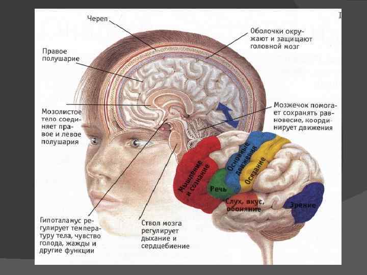 ЦНС. ГОЛОВНОЙ МОЗГ. Головной мозг расположен в полости черепа, масса мозга у взрослого человека 1400— 1450 г. В головном мозге различают 5 отделов: концевой мозг или большие полушария; промежуточный мозг, состоящий из зрительных бугров, коленчатых тел и подбугорной области; средний мозг, включающий четверохолмие и ножки мозга; задний мозг, к которому относится мозжечок и мост мозга; продолговатый мозг.