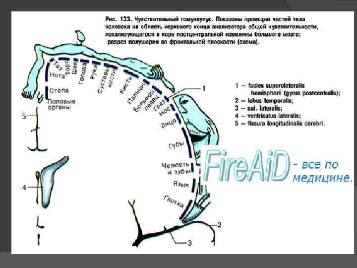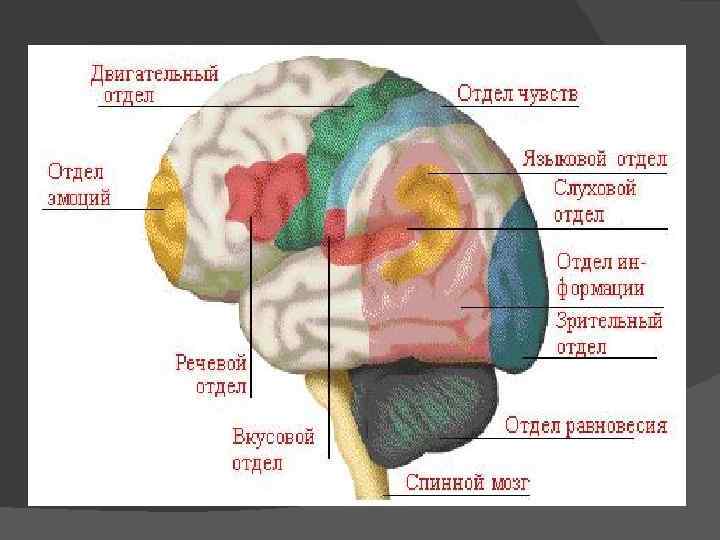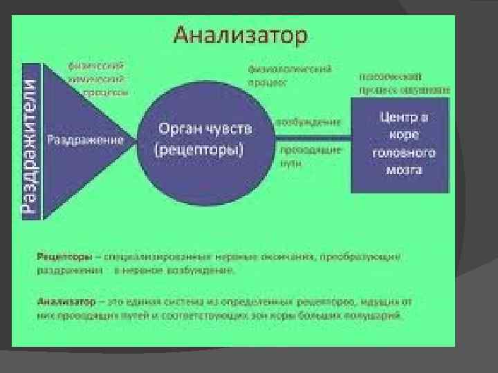 — периферический отдел — рецепторы, воспринимающие раздражения и располагающиеся чаще всего в органах чувств; — проводниковый отдел — нервные пути, по которым возбуждение передается в кору больших полушарий головного мозга; — центральный отдел — участок коры головного мозга, преобразующий полученное раздражение в определенное ощущение