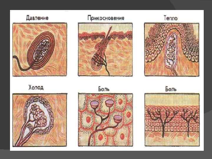 КОЖНЫЙ АНАЛИЗАТОР Одной из важнейших функций кожи является рецепторная. В коже заложено огромное количество рецепторов, воспринимающих различные внешние раздражения: боль, тепло, холод, прикосновение. На 1 см 2 кожи располагается приблизительно 200 болевых рецепторов, 20 холодовых, 5 тепловых и 25 воспринимающих давление, которые представляют собой периферический отдел кожного анализатора.