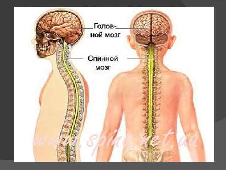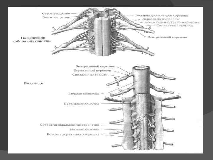 ЦНС. СПИННОЙ МОЗГ. Спинной мозг расположен в спинномозговом канале. Он представляет собой длинный тяж примерно цилиндрической формы, вверху заканчивающийся на уровне большого затылочного отверстия, внизу — на уровне второго поясничного позвонка. На месте отхождения нервов к верхним и нижним конечностям имеется два утолщения — шейное и поясничное. Средняя длина спинного мозга у мужчин — 45 см, у женщин 41— 42 см, масса 34— 38 г.