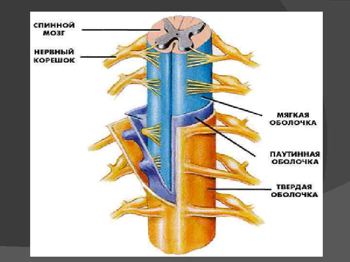 ЦНС. СПИННОЙ МОЗГ. Спинной мозг выполняет рефлекторную и проводниковую функции. Рефлекторная деятельность спинного мозга разнообразна и осуществляется каждым ее сегментом. В шейных сегментах расположены центры рефлекторных движений диафрагмы, шейных мышц, мышц плечевого пояса и верхних конечностей; в грудных сегментах — центры мышц туловища;