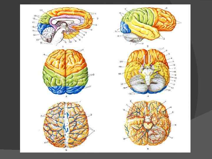 ЦНС. ГОЛОВНОЙ МОЗГ. Кора больших полушарий представляет собой высший отдел центральной нервной системы, который позже всего появился в процессе эволюции и позже других отделов мозга формируется в ходе индивидуального развития. Кора состоит из слоя серого вещества толщиной 2— 3 мм и содержит около 14 млрд. нервных клеток. Благодаря многочисленным бороздам и извилинам поверхность коры достигает по площади 2 м 2.