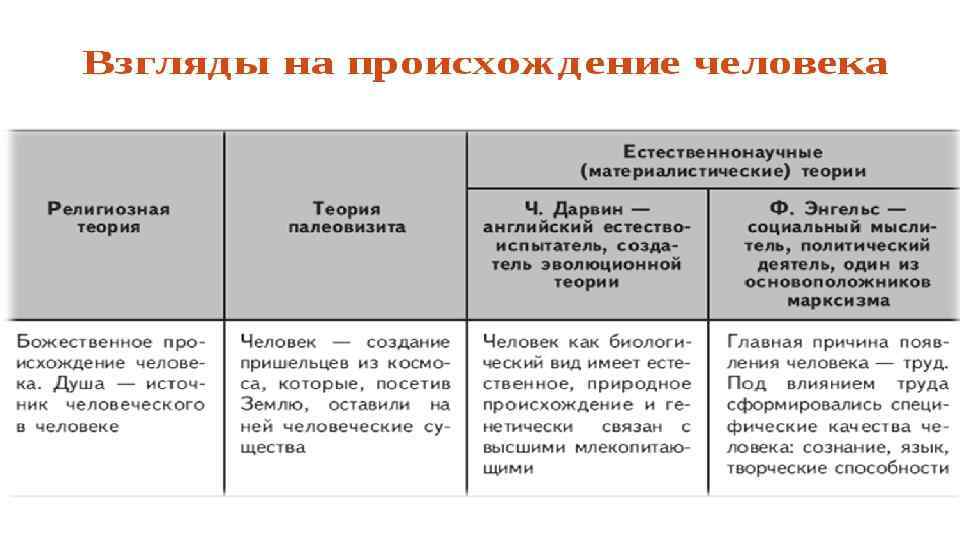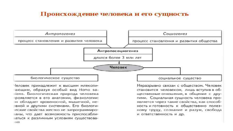 Человек как существо Биологическое Как биологическое существо человек принадлежит к высшим млекопитающим, образуя особый вид Homo sapiens. Биологическая природа человека проявляется в его анатомии, физиологии. Как биологический вид человек обладает кровеносной, мышечной, нервной, костной и другими системами. Его биологические свойства жестко не запрограммированы, что дает возможность приспосабливаться к различным условиям существования. Социальное Человек становится человеком, лишь всту пая в общественные отношения, в общение с другими людьми. Индивид, в силу определенных причин оторванный с рождения от общества, остается животным. Поскольку человеческая деятельность может существовать только как общественная, сущность человека предстает как совокупность общественных отношений.