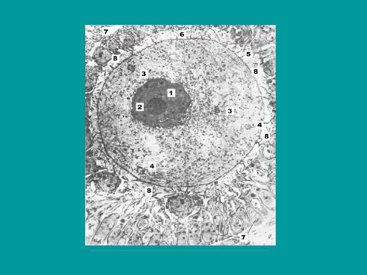 Овоцит из фолликула яичника • • 1. Ядро 2. Ядрышко 3. Желточные зерна в цитоплазме 4. Мультивизикулярные тельца 5. Клеточная оболочка (оволемма) с микроворсинками 6. Блестящая зона 7. Фолликулярные клетки зернистого слоя 8. Отростки фолликулярных клеток