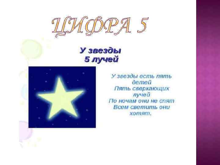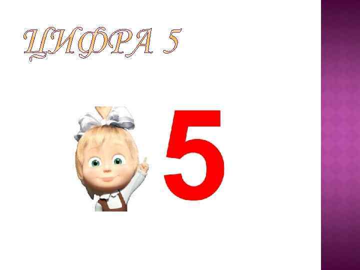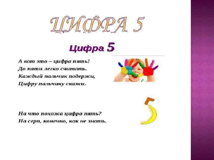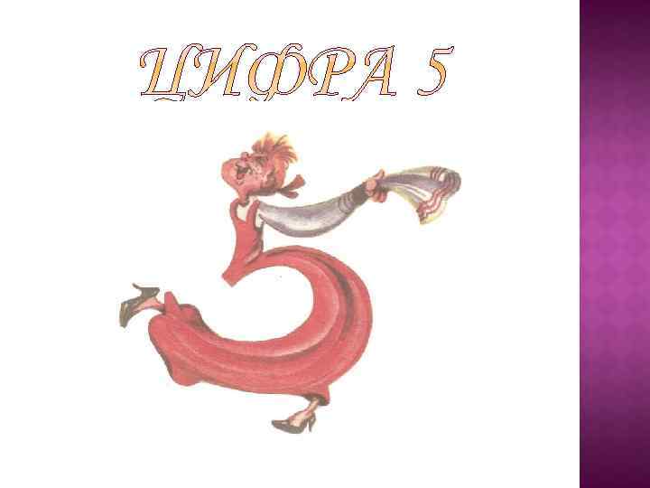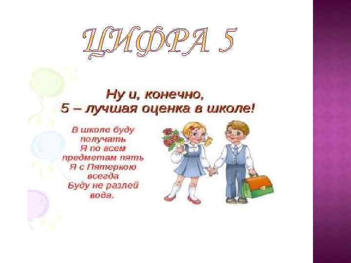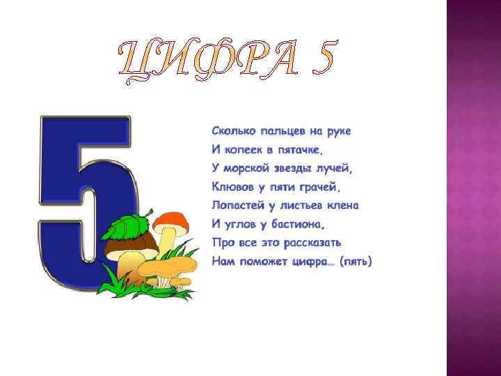 Кто стучится в дверь ко мне С толстой сумкой на ремне, С цифрой пять на медной бляшке, В синей форменной фуражке, Это он, Ленинградский почтальон. Автор: С. Я. Маршак *** А потом пошла плясать По бумаге цифра пять. Руку вправо протянула, Ножку круто изогнула. Автор: С. Я. Маршак