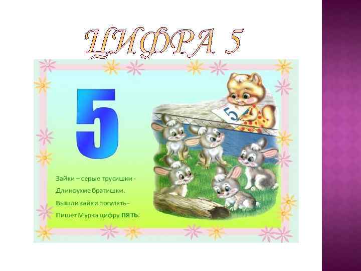 Ленивый дождь шёл пять часов. Зайчишки под кустом дрожали, А на поляне сто грибов В восторге шляпы вверх бросали! *** Написать цифру пять, Что крючок нарисовать. Но у цифры, у крючка, Леска больно коротка. Автор: В. Б. Бакалдин