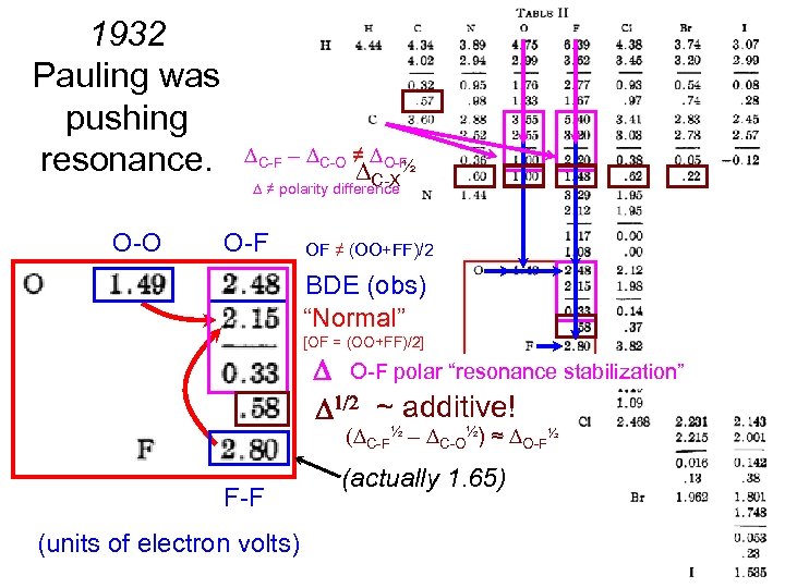 1932 Pauling was pushing resonance. C-F – C-O ≠ O-F ½ C-X ≠ polarity difference O-O O-F OF ≠ (OO+FF)/2 BDE (obs) “Normal” [OF = (OO+FF)/2] O-F polar “resonance stabilization” ~ additive! ( C-F½ – C-O½) ≈ O-F½ F-F (units of electron volts) (actually 1. 65)