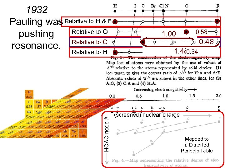 1932 Pauling was Relative to H & F Relative to O pushing Relative to C resonance. HOAO node # Relative to H 1. 00 0. 58 0. 48 1. 48 0. 34 (screened) nuclear charge Mapped to a Distorted Periodic Table