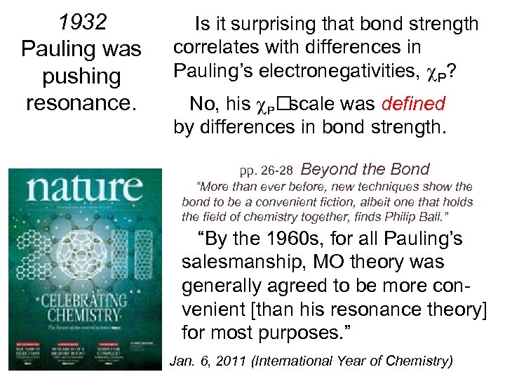 1932 Pauling was pushing resonance. Is it surprising that bond strength correlates with differences in Pauling’s electronegativities, P? No, his P scale was defined by differences in bond strength. pp. 26 -28 Beyond the Bond “More than ever before, new techniques show the bond to be a convenient fiction, albeit one that holds the field of chemistry together, finds Philip Ball. ” “By the 1960 s, for all Pauling’s salesmanship, MO theory was generally agreed to be more convenient [than his resonance theory] for most purposes. ”. Jan. 6, 2011 (International Year of Chemistry)