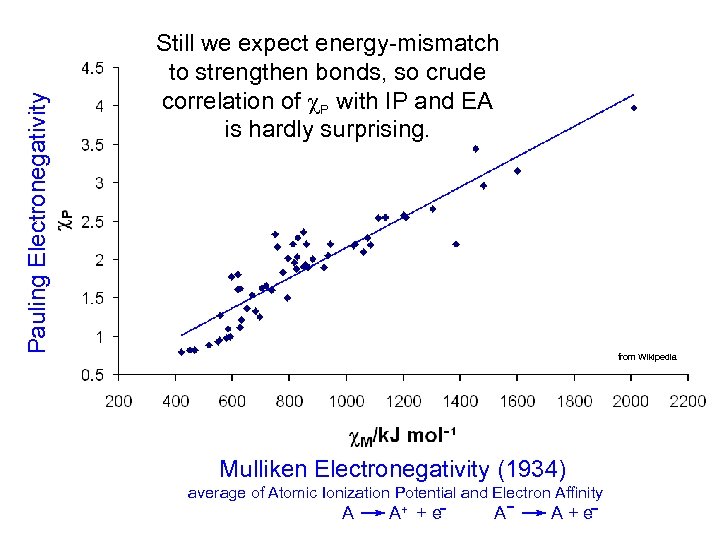 Pauling Electronegativity Still we expect energy-mismatch to strengthen bonds, so crude correlation of P with IP and EA is hardly surprising. from Wikipedia Mulliken Electronegativity (1934) average of Atomic Ionization Potential and Electron Affinity A A+ + e A A + e