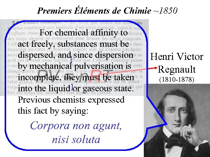 Premiers Éléments de Chimie ~1850 For chemical affinity to act freely, substances must be dispersed, and[ since dispersion by mechanical pulverisation is incomplete, they must be taken into the liquid ]or gaseous state. Previous chemists expressed this fact by saying: PV = n. RT Corpora non agunt, nisi soluta Henri Victor Regnault (1810 -1878)