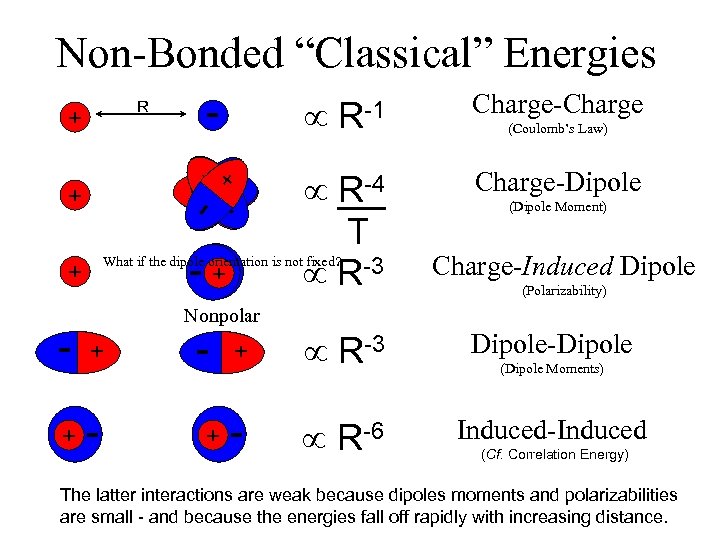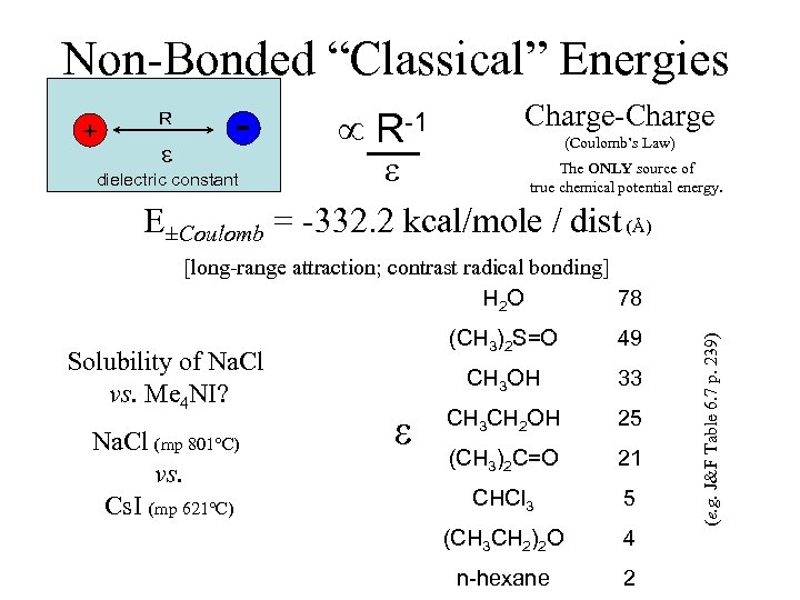 Non-Bonded “Classical” Energies + R - Charge-Charge R-1 (Coulomb’s Law) The ONLY source of true chemical potential energy. E±Coulomb = -332. 2 kcal/mole / dist (Å) dielectric constant (gravity & magnetism are for wimps; [long-range attraction; contrast radical bonding] the “strong force” is for physicists) Solubility of Na. Cl vs. Me 4 NI? Na. Cl (mp 801°C) vs. Cs. I (mp 621°C) (CH 3)2 S=O 49 CH 3 OH 78 33 CH 3 CH 2 OH 25 (CH 3)2 C=O 21 CHCl 3 5 (CH 3 CH 2)2 O 4 n-hexane 2 (e. g. J&F Table 6. 7 p. 239) H 2 O
