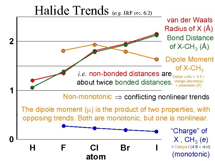 Halide Trends (e. g. J&F sec. 6. 2) van der Waals Radius of X (Å) Bond Distance of X-CH 3 (Å) 2 Dipole Moment of X-CH 3 i. e. non-bonded distances are Debye units = 4. 8 about twice bonded distances. charge (electrons) separation (Å) 1 Non-monotonic conflicting nonlinear trends The dipole moment ( ) is the product of two properties, with opposing trends. Both are monotonic, but one is nonlinear. 0 H F Cl atom Br I “Charge” of X , CH 3 (e) = Debye / (4. 8 dist) (monotonic)