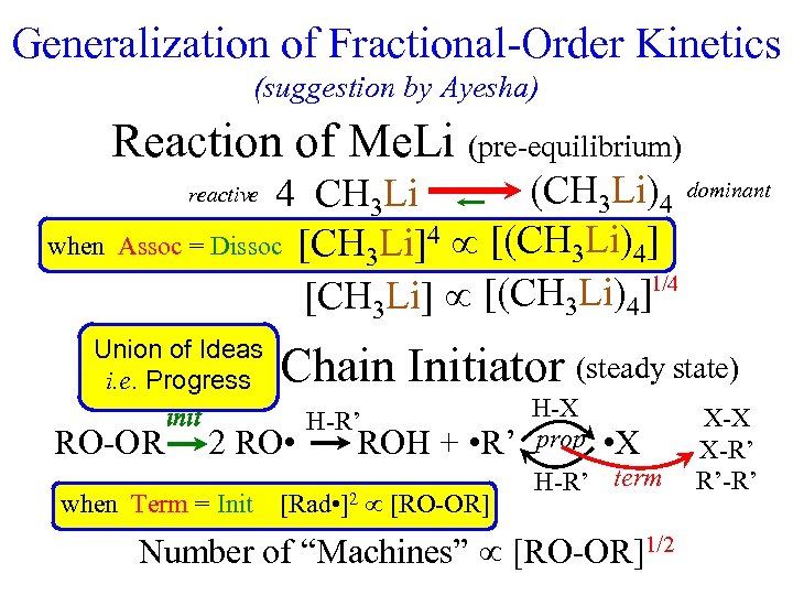 Generalization of Fractional-Order Kinetics (suggestion by Ayesha) Reaction of Me. Li (pre-equilibrium) (CH 3 Li)4 dominant 4 CH 3 Li Assoc = Dissoc [CH 3 Li]4 [(CH 3 Li)4] 1/4 [CH 3 Li] [(CH 3 Li)4] reactive when Union of Ideas i. e. Progress init Radical-Chain Initiator (steady state) RO-OR 2 RO • when Term = Init H-R’ ROH + • R’ [Rad • ]2 [RO-OR] H-X prop • X H-R’ term Number of “Machines” [RO-OR]1/2 X-X X-R’ R’-R’