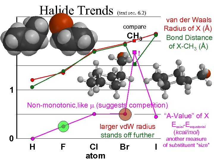 Halide Trends (text sec. 6. 2) van der Waals Radius of X (Å) Bond Distance of X-CH 3 (Å) compare CH 3 2 ! 1 0 Non-monotonic, like (suggests competition) “A-Value” of X Eaxial-Eequatorial larger vd. W radius (kcal/mol) stands off further another measure H F Cl atom Br I of substituent “size”