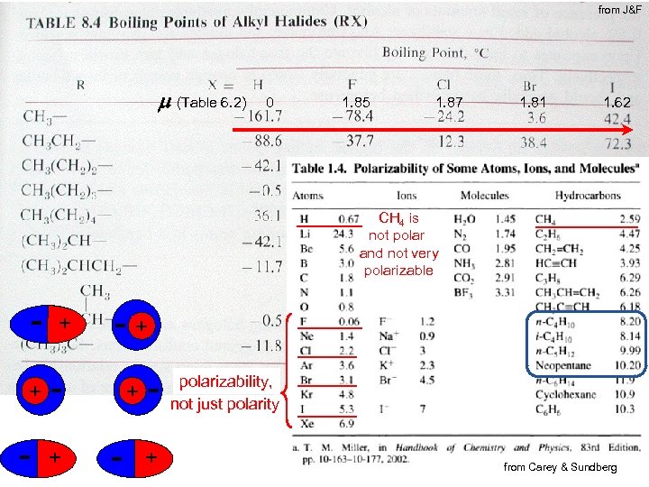 from J&F Boiling points (Table 6. 2) 0 1. 85 1. 87 1. 81 1. 62 CH 4 is not polar and not very polarizable - + + + -+ polarizability, not just polarity from Carey & Sundberg -