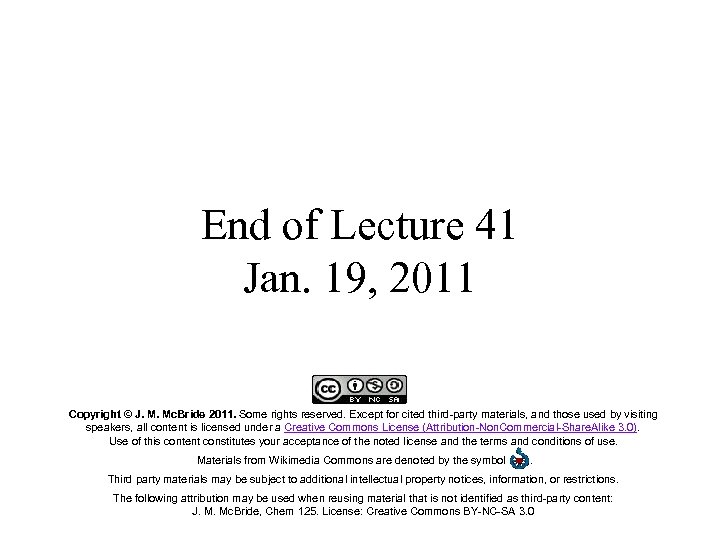 End of Lecture 41 Jan. 19, 2011 Copyright © J. M. Mc. Bride 2011. Some rights reserved. Except for cited third-party materials, and those used by visiting speakers, all content is licensed under a Creative Commons License (Attribution-Non. Commercial-Share. Alike 3. 0). Use of this content constitutes your acceptance of the noted license and the terms and conditions of use. Materials from Wikimedia Commons are denoted by the symbol . Third party materials may be subject to additional intellectual property notices, information, or restrictions. The following attribution may be used when reusing material that is not identified as third-party content: J. M. Mc. Bride, Chem 125. License: Creative Commons BY-NC-SA 3. 0