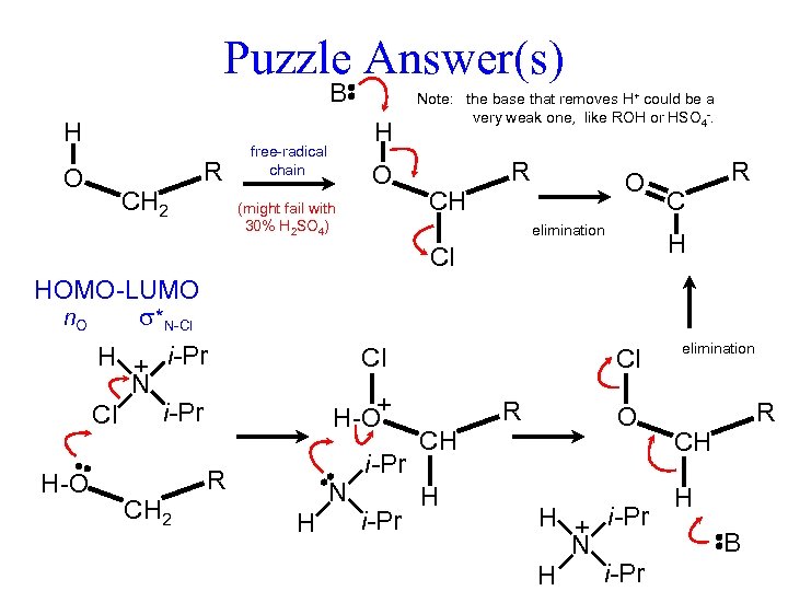 Puzzle Answer(s) B H O R CH 2 H free-radical chain O (might fail with 30% H 2 SO 4) Note: the base that removes H+ could be a very weak one, like ROH or HSO 4 -. R O CH elimination H-O Cl H-O+ R CH 2 N H i-Pr Cl R CH H Cl HOMO-LUMO n. O *N-Cl H + i-Pr N i-Pr Cl R O H + i-Pr N i-Pr H elimination R CH H B