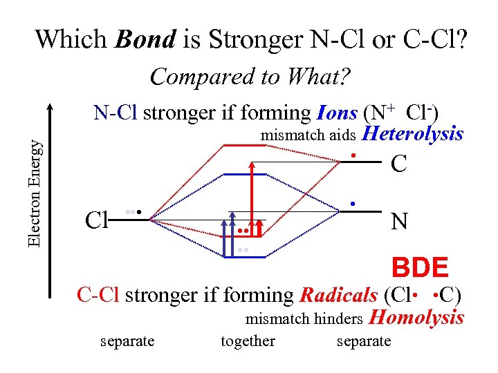 Which Bond is Stronger N-Cl or C-Cl? Electron Energy Compared to What? N-Cl stronger if forming Ions (N+ Cl-) mismatch aids Heterolysis • Cl • • • C N BDE C-Cl stronger if forming Radicals (Cl • • C) mismatch hinders Homolysis separate together separate