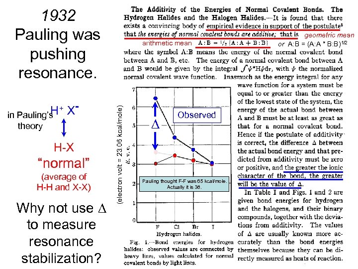1932 Pauling was pushing resonance. theory H-X “normal” (average of H-H and X-X) Why not use to measure resonance stabilization? (electron volt = 23. 06 kcal/mole) H+ Xin Pauling’s arithmetic mean Observed Pauling thought F-F was 65 kcal/mole. Actually it is 38. geometric mean or A: B = (A: A * B: B)1/2