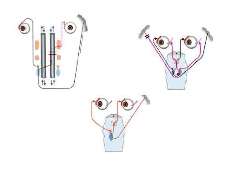 Содружественные движения глаз: Ствол мозга: МПП, ядра Кора: поля 46, 4, 6, 8, 9, 7, 19, 37, 39