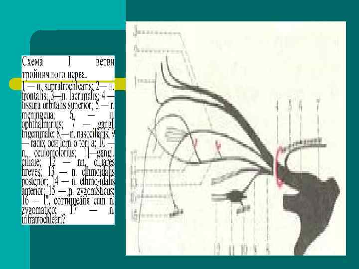 Ситуационные задачи l На консультацию к неврологу была направлена пациентка, у которой при проведении рентгенографии придаточных пазух носа при подозрении на фронтит было выявлено объемное образование в области верхнего медиального края левой глазницы. Кроме того, больная предъявляет жалобы на онемение кожи левой щеки и двоение в глазах. Поражение каких нервов можно предположить у данной пациентки? В каком месте пострадали нервы? Как называется данный синдром?