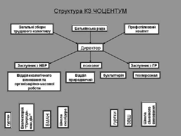 Форми організації діяльності: ü гуртки; ü обласна заочна біологічна школа для сільської учнівської молоді; ü школа сімейного виховання для дітей сиріт; ü навчання на хіміко-біологічному факультеті Буковинської малої академії наук; ü еколекторій "Природа - наш дім"; ü відеотека "Екологія XXI століття"; ü семінари, конференції як педагогічні, так і учнівські; ü екотабори, тематичні екологічні експедиції; ü практичні природоохоронні акції; ü конкурси, свята, фестивалі, виставки та інші масові заходи.