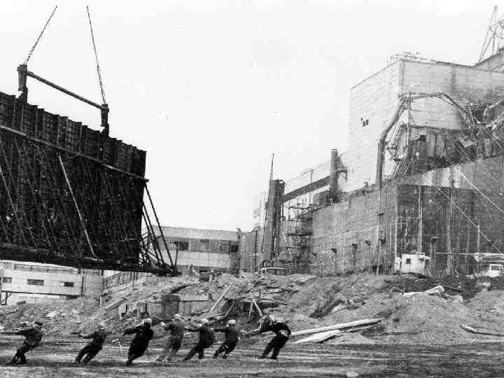 Затем начались работы по очистке территории и захоронению разрушенного реактора. Вокруг 4 -го блока был построен бетонный «саркофаг» (т. н. объект «Укрытие» ). Так как было принято решение о запуске 1 -го, 2 -го и 3 -го блоков станции, радиоактивные обломки, разбросанные по территории АЭС и на крыше машинного зала были убраны внутрь саркофага или забетонированы.