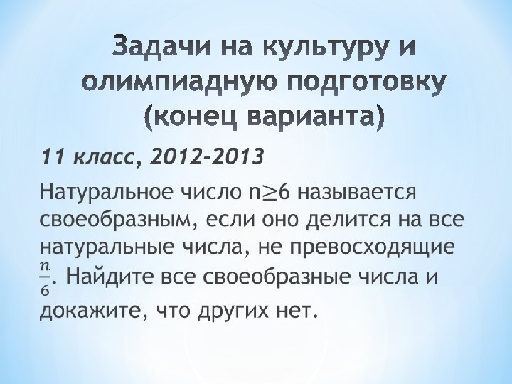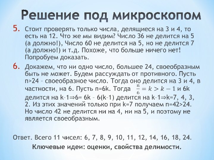 1. 2. 3. 4. Начинаем с числа 6. На 1 это число делится (как и всякое другое), а больше ничего и не надо. Значит, число 6 – своеобразное. А от каких ещё чисел ничего не надо? Конечно, от чисел 7, 8, 9. 10, 11. Значит они тоже своеобразные. А вот число 12 должно делиться ещё и на 2. Но оно чётное, и потому тоже своеобразное. А число 13 не будет своеобразным, поскольку оно на 2 не делится. И вообще ясно, что в полуинтервале [12; 17) своеобразными будут только чётные числа. Ясно, что теперь надо переходить к промежутку [18; 23). Своеобразные числа из этого промежутка должны делиться на 3 и на 2, то есть на 6. Единственное такое число – 18. Число 24 делится на 3 и 4, поэтому тоже будет своеобразным. А дальше?