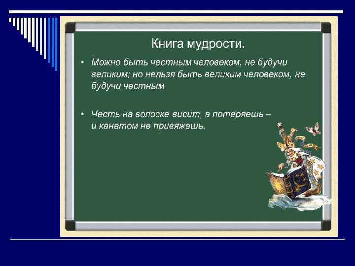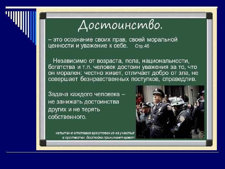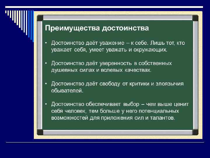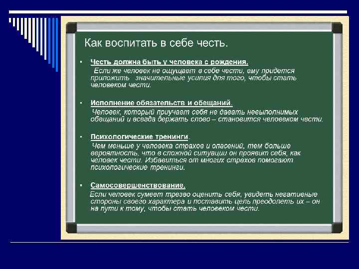 Честь o Это готовность отстаивать свои интересы своего государства, пренебрегая при этом даже угрозой для жизни; o это внутреннее, данное самому себе право оценивать себя и своё существование в категориях самоуважения