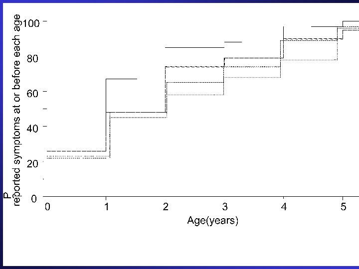 The 1995 Tasmanian Asthma Survey Methods Full 1995 cross-sectional sample N = 6, 378 (92% of eligible) with parental questionnaires The 1988 to 1995 Tasmanian Infant Health Survey (TIHS) 1988 N = 1, 111 (81% of eligible) infants participated in home interview and survived the first year. 1995 Follow-up sample N = 863*(78%), TIHS children born in 1988 with 1988 home interview Data, plus 1995 asthma data avail ble and parental consent for record linkage. Ponsonby et al Epidemiology 2003
