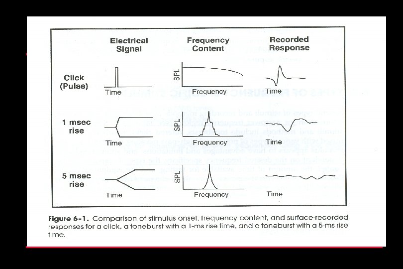 What We Know About ABR Clicks l Click commonly used, but……can give misleading information Click has energy at all frequencies transduced by earphone l Within limits, regions of normal hearing will generate ABR, even with regions of hearing loss l ABR tests avoid problems associated with reverse middle ear transmission, but potential still exists for missing hearing loss with click-evoked ABR l