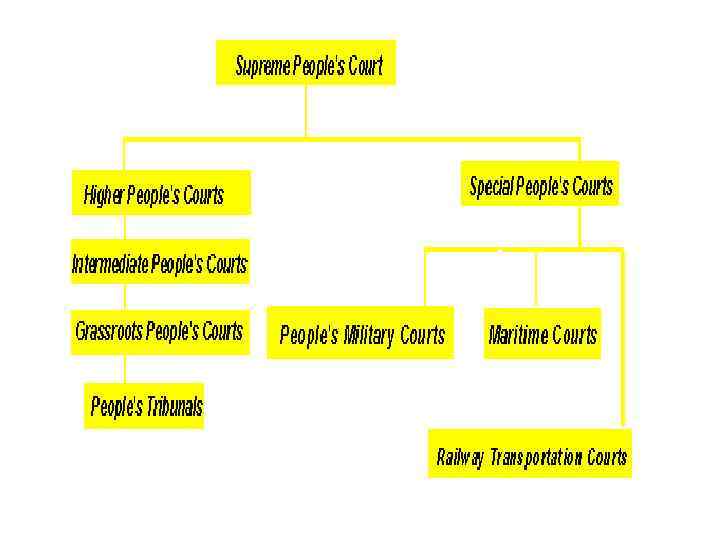 Перевод слов: • 1)According to Criminal Procedure Law of PRC-Уголовнопроцессуальный кодекс КНР • 2) behalf of the states- От имени государства • 3) PRC –Китайская Народная Республика • 4) chief-вождь • 5) The Supreme People's Court- Верховный народный суд • 6) The Higher People's Courts- высший народный суд • 7) provincial level- на областном уровне. • 8) responsible for settling civil disputes- несет ответственность за урегулирование гражданских споров. • 9) handling- обработка • 10) minor criminal cases – незначительные уголовные дела • 11) require- требуют • 12) formal handling- формальное обращение