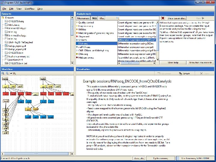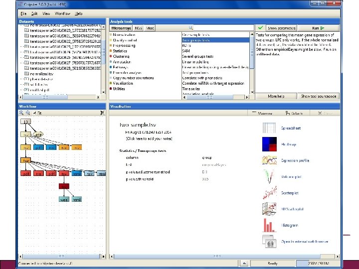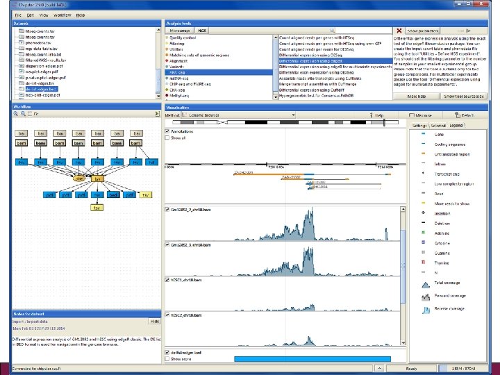 Analysis tools for different kinds of data Ø 140 NGS tools for Ø 140 microarray tools for • RNA-seq • gene expression • mi. RNA-seq • mi. RNA expression • exome/genome-seq • protein expression • Ch. IP-seq • a. CGH • FAIRE/DNase-seq • SNP • Me. DIP-seq • integration of different data • CNA-seq • Metagenomics (16 S r. RNA) Ø 60 tools for sequence analysis • BLAST, EMBOSS, MAFFT • Phylip
