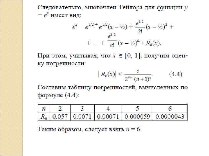 Пример. Найдем приближение функции y = многочленом Тейлора на отрезке [0, 1] с точностью Ɛ= Выберем a = ½, т. е. в середине отрезка. При этом величина погрешности в левой части принимает минимальное значение. Из математического анализа известно, что для k-ой производной от справедливо равенство: