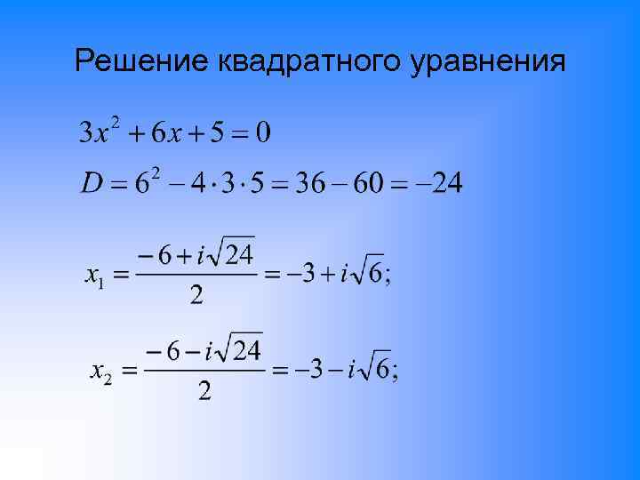 Решение квадратных уравнений 3 x 2 + 6 x + 5=0 a=3 b=6 c=5 D=b 2 - 4 ac D=36– 60 = -24 D<0, корней нет