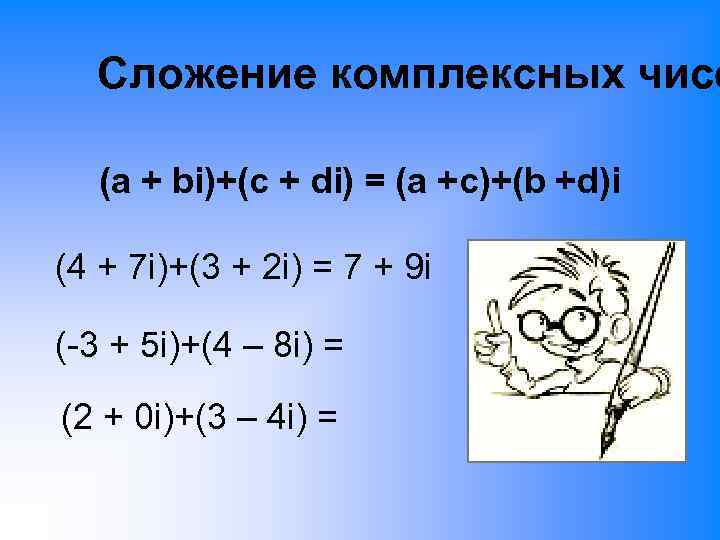Сложение комплексных чисе (a + bi)+(c + di) = (a +c)+(b +d)i (4 + 7 i)+(3 + 2 i) = 7 + 9 i (-3 + 5 i)+(4 – 8 i) = 1 - 3 i (2 + 0 i)+(3 – 4 i) = 5 - 4 i