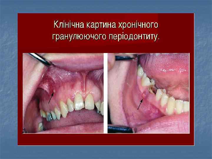 Хронічний гранулюючий періодонтит n n Нерідко виявляється у вигляді неприємних, іноді слабких больових відчуттів (відчуття розпирання, незручності). Ці відчуття виникають періодично та часто супроводжуються появою свища з гнійним виділенням та грануляційної тканини, який через деякий час зникає. Визначається гіперемія ясен біля хворого зуба; при натисканні на цю ділянку ясен тупим кінцем інструменту виникає заглиблення, яке після видалення інструменту зникає не одразу. При пальпації ясен хворий відчуває неприємні відчуття або біль. Перкусія нелікованого зуба викликає підвищену чутливість, а іноді й больову реакцію.
